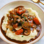 Mushroom Bourguignon is a rich, flavorful vegan stew made with hearty cremini mushrooms, carrots, onions, and a robust red wine sauce thickened with flour. Perfectly paired with creamy mashed potatoes, this dish offers a comforting and elegant meal that’s ideal for dinner.