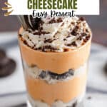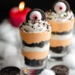 A delightful No Bake Oreo Cheesecake Parfait featuring creamy orange and white cheesecake layers with a crunchy Oreo crust, topped with spooky Oreo eyes for a fun and festive treat. Perfect for Halloween or any occasion, this easy-to-make dessert requires no baking and is ready in less than an hour plus chilling time.
