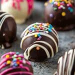5. Dip the Truffles: Dip each chilled truffle into the melted chocolate of your choice, coating completely. Return to parchment paper and decorate with sprinkles or extra chocolate drizzle if desired.