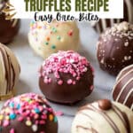 Delicious no-bake Oreo truffles made with crushed Oreo cookies and cream cheese, dipped in white and dark chocolate, and decorated with sprinkles. Perfect sweet bite-sized treats for any occasion.