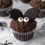 These Bat Cupcakes are a spooky and delicious Halloween treat featuring chocolate cupcakes topped with homemade chocolate buttercream frosting and decorated with Oreo cookies and candy eyes to resemble bats. Perfect for festive parties and easy to make with a chocolate cake mix.