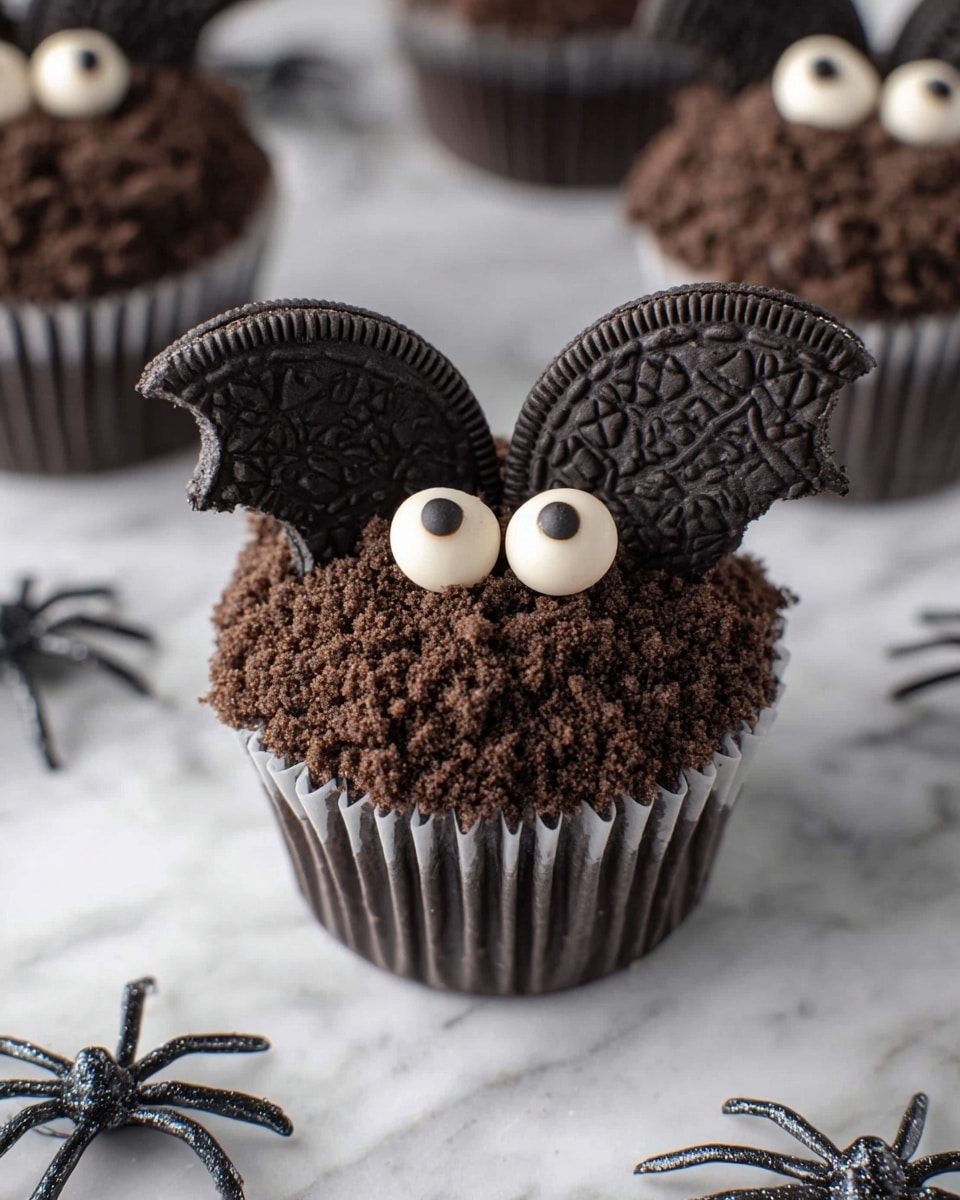 - Assemble the bats: Stick the Oreo halves into the sides of the frosted cupcakes to form bat wings. Place one Oreo Mini cookie in front of the wings on the frosting. Finally, press two candy eyes onto each cupcake just above the Oreo Mini to complete the bat faces.