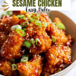 A flavorful Paleo Sesame Chicken recipe perfect for Whole30, featuring tender chicken thighs fried to a golden crisp and coated in a rich, slightly sweet sesame sauce made with medjool dates and coconut aminos. This dish is garnished with sesame seeds and scallions, offering a delicious, healthy alternative ideal for those following paleo and Whole30 diets.