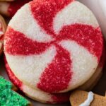 Delight in these festive Peppermint Swirl Sugar Cookies featuring a beautiful red and white swirl, perfectly chewy texture, and a subtle hint of peppermint or almond extract. These cookies are great for holidays or any time you want a sweet treat with a pop of color and texture from the sanding sugar coating.