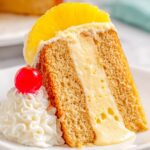 - Assemble the Cheesecake: Carefully invert one pineapple cake onto a flat surface, such as a cutting board. Invert the other cake onto the serving plate. Remove the sides of the cheesecake springform pan and gently lift the cheesecake off the bottom using a spatula if needed. Place the cheesecake layer on top of the first cake layer. Then place the second cake layer on top of the cheesecake. You can serve immediately or refrigerate until ready to serve. Optionally, garnish with whipped cream.