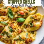 Delicious Pumpkin Pesto Cheese Stuffed Shells featuring savory ground chicken sausage, creamy ricotta and fontina cheeses, and a flavorful pumpkin and vodka sauce, baked to golden perfection and topped with fresh basil.