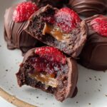 These Raspberry Brownie Date Bites are a delightful no-bake treat featuring a rich brownie layer topped with homemade raspberry chia jam and a smooth melted chocolate coating. Perfect as a healthy snack or dessert, they combine natural sweetness from medjool dates and raspberries with wholesome ingredients like cocoa, nut butter, and oat flour.