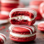 Delicious and elegant Red Velvet Macarons featuring a smooth cream cheese frosting filling. These delicate French cookies combine almond flour, cocoa powder, and a vibrant red gel food coloring for a beautiful presentation. Perfect for special occasions or treats, with a tender texture and the rich flavor of cream cheese frosting.