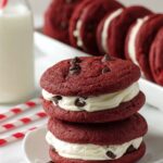 Delicious homemade red velvet sandwich cookies featuring soft, cocoa-infused cookies filled with a creamy vanilla cream cheese frosting. Perfect for parties or a special treat, these cookies combine classic red velvet flavor with chocolate chips for an extra indulgent touch.