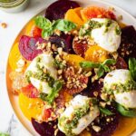 - Assemble the salad: On a serving platter, arrange slices of blood orange and cara cara orange. Place the burrata balls carefully in the center. Arrange the beet wedges around the burrata, scatter chopped pistachios over the top, and drizzle with basil oil. Sprinkle with flaky sea salt and torn basil leaves just before serving.