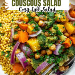 A flavorful and nutritious roasted pumpkin couscous salad that can be enjoyed hot or cold, featuring a blend of roasted vegetables, chickpeas, and spiced couscous, topped with optional pumpkin seeds, cranberries, and parsley for extra texture and taste.