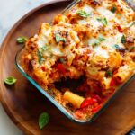 A hearty and comforting baked ziti recipe featuring tender roasted vegetables, rich marinara sauce, and a melty blend of mozzarella and cottage cheese. Perfect for family dinners, this dish combines roasted cauliflower, bell peppers, and onions with pasta baked to cheesy perfection.