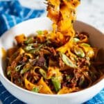 I’ve frozen the beef portion successfully by itself before — just cool completely, transfer to a freezer-safe container, and freeze for up to 3 months. I don’t recommend freezing the noodles because they can get mushy upon thawing, so I add fresh noodles when reheating after defrosting the beef.
