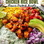 A vibrant and flavorful Street Corn Chicken Rice Bowl featuring tender, spiced chicken, creamy street corn topping, and fluffy cilantro lime rice. Perfect for a quick, satisfying meal with customizable toppings.