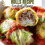 Traditional Stuffed Cabbage Rolls with a savory ground beef and rice filling, simmered in a rich tomato sauce and baked to perfection. This comforting dish combines tender cabbage leaves with a flavorful meat mixture and tangy tomato sauce, perfect for a hearty family meal.
