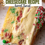 A festive Sugar Cookie Cheesecake featuring a buttery sugar cookie crust, creamy vanilla cheesecake studded with sprinkled cookie dough balls, and topped with a luscious white chocolate ganache and colorful Christmas sprinkles.