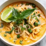 This Easy Thai Chicken Curry Soup is a flavorful and comforting dish featuring aromatic Thai red curry paste, creamy coconut milk, and tender shredded chicken with rice noodles. It comes together quickly on the stovetop, making it perfect for a weeknight meal. Fresh herbs like basil, cilantro, and scallions add brightness and freshness, while a squeeze of lime juice balances the richness.