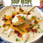 A creamy and comforting potato soup made with crispy bacon, tender gold potatoes, and a blend of savory ingredients. This ultimate potato soup recipe combines a rich, velvety texture with flavorful toppings like shredded cheddar cheese, chives, and sour cream for a perfect bowl any time.