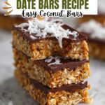 Delicious Toasted Coconut Date Bars featuring medjool dates, toasted coconut flakes, almond butter, and a drizzle of rich vegan dark chocolate. These no-bake bars are a perfect healthy snack or dessert option that combines natural sweetness with crunchy texture and creamy chocolate coating.