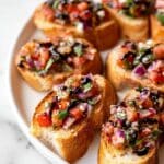 Whenever I serve this, I love topping the bruschetta with a few extra whole basil leaves or a little sprinkle of flaky sea salt. Sometimes I’ll add a few shavings of parmesan just before serving for a salty, nutty touch — it’s easy to skip but totally delightful if you want to dress it up.