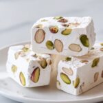 This Traditional Italian Torrone recipe features soft white nougat packed with toasted almonds and pistachios. Sweetened with honey and sugar syrup, it is delicately flavored with vanilla extract or citrus zest, making a delightful chewy treat perfect for sharing.