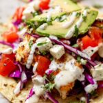 - Assemble the Tacos: Place a few pieces of the fried vegan fish on each warmed tortilla. Add desired toppings such as cabbage, tomatoes, onions, cilantro, avocado, and crumbled vegan cheese on top of the fish. Drizzle generously with the prepared fish taco sauce. If the fish pieces are large, slice them into smaller portions for easier eating.
