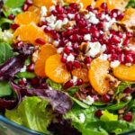 A vibrant and refreshing Winter Salad featuring mixed spring greens, juicy mandarin orange segments, pomegranate seeds, creamy feta cheese, and crunchy candied pecans, all tossed in a tangy honey-Dijon vinaigrette dressing. Perfect as a light lunch or a colorful side dish during cold months.